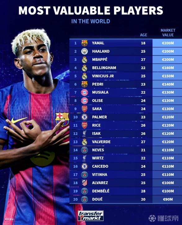 德转列全球身价榜:亚马尔、哈兰德、姆巴佩并列第一,19人破亿