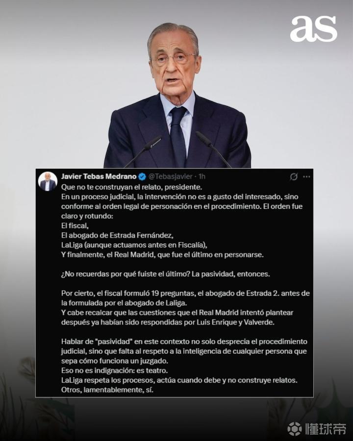 “主席大人,别让人家给你瞎编故事啦。司法程序里,谁先谁后可不是由当事人说了算,得按法律来——这顺序明明白白,没得商量:先是检察官,然后是埃斯特拉达-费尔南德斯(小编插一句:这哥们儿是前裁判,2023年2月,他就“内格雷拉案”向法院提了刑事诉讼。)的律师,接着是西甲联盟(虽然咱们在检察院动手前就已经开始行动了),最后才是皇家马德里,你们可是压轴的。”
