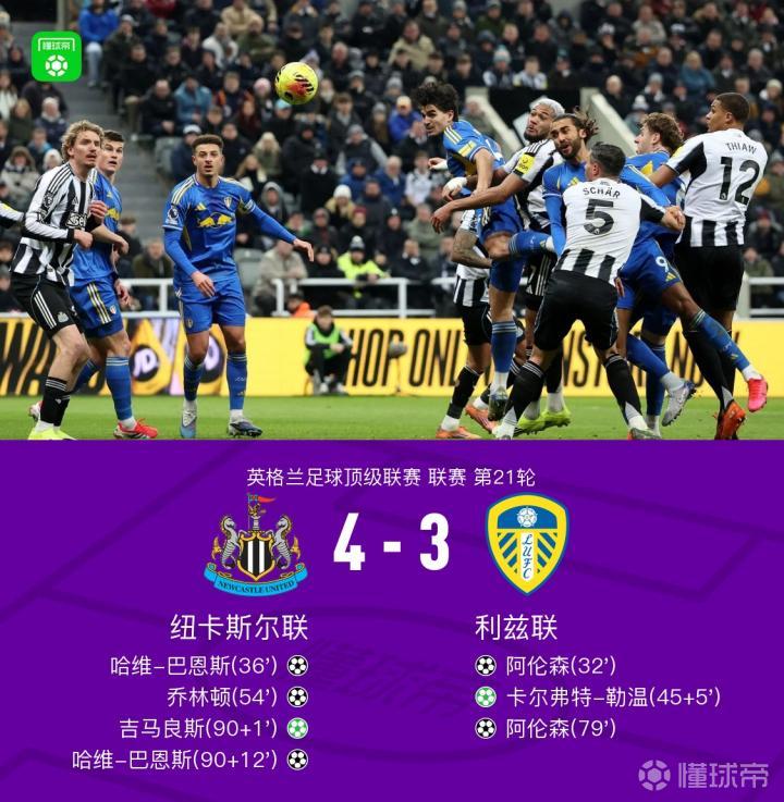 纽卡4-3利兹联,巴恩斯读秒绝杀+双响,阿伦森双响+送点,勒温、吉马良斯传射
