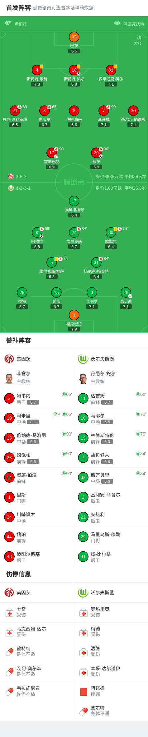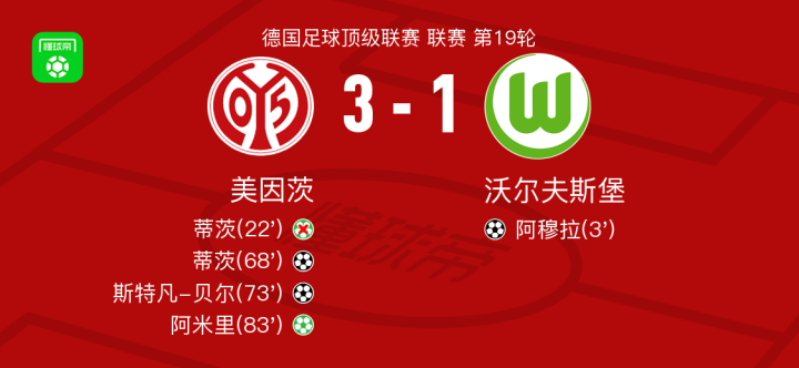 北京时间1月24日,德国足球顶级联赛第19轮,美因茨主场迎战沃尔夫斯堡。阿穆拉率先破门,为客队取得领先;随后蒂茨主罚点球未能命中;美因茨持续施压,蒂茨接阿米里助攻扳回一城;斯特凡-贝尔再入一球扩大优势;阿米里主罚点球命中,锁定胜局。最终美因茨3–1战胜沃尔夫斯堡。>"content="">点击查看本场比赛详细数据>>>"content="">点击查看德甲完整积分榜>>精彩瞬间第3分钟,沃尔夫斯堡球2026-01-25 00:29:42