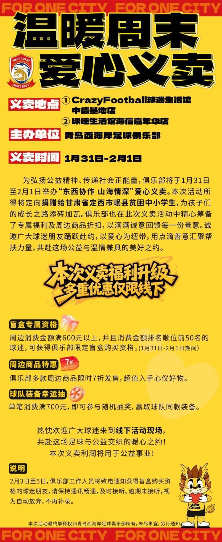 青岛西海岸官方写道:为弘扬公益精神、传递社会正能量,俱乐部将于1月31日至2月1日举办"东西协作山海情深"爱心义卖。