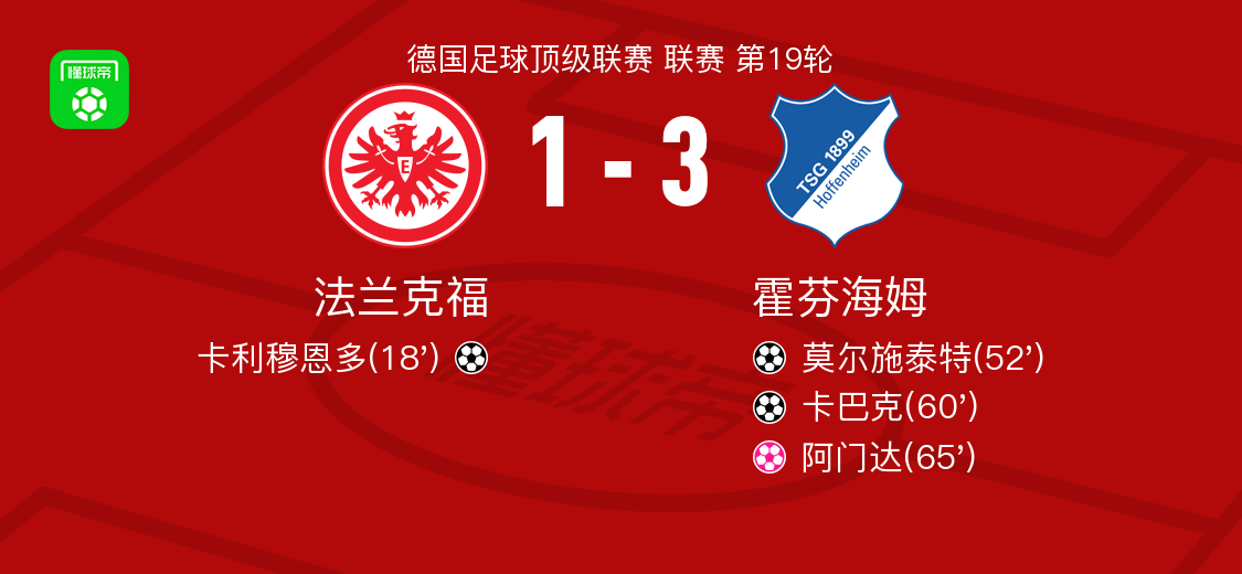 霍芬海姆3-1逆转法兰克福,卡巴克破门,莫尔施泰特建功