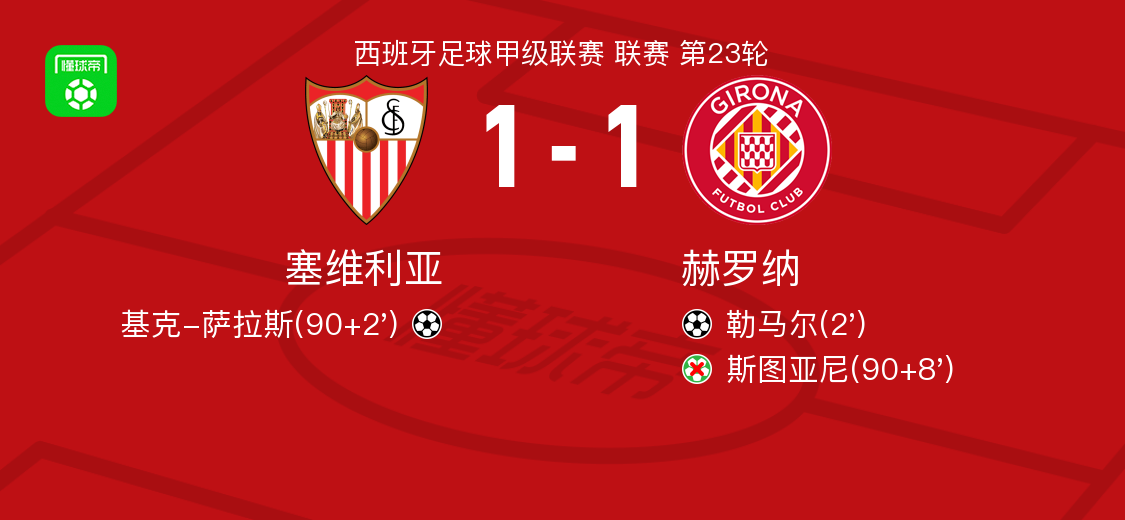 北京时间2月8日西班牙足球甲级联赛联赛第23轮,塞维利亚主场对阵赫罗纳。塞维利亚基克-萨拉斯破门。赫罗纳勒马尔破门。最终比分塞维利亚1-1赫罗纳。>"content="">点击查看本场比赛详细数据>>>"content="">点击查看西甲完整积分榜>>精彩瞬间第2分钟,赫罗纳球员乌戈-林孔助攻勒马尔打入一球。下半场补时第2分钟,塞维利亚球员基克-萨拉斯打入一球。下半场补时第8分钟,赫罗纳球员斯图亚2026-02-09 01:11:48