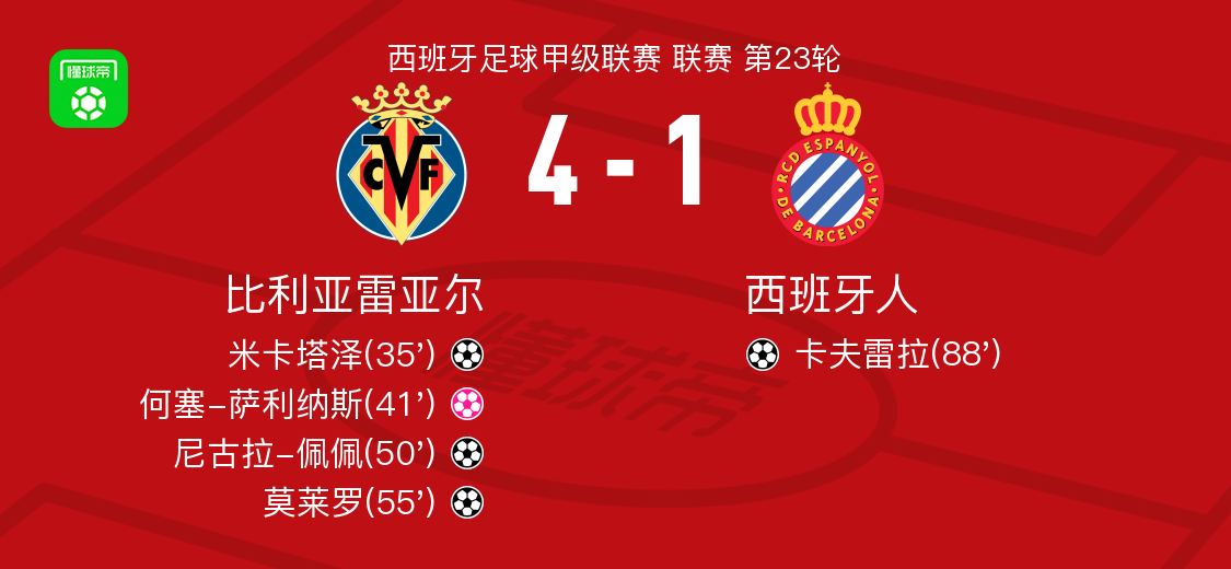 北京时间2月10日西班牙足球甲级联赛联赛第23轮,比利亚雷亚尔主场对阵西班牙人。比利亚雷亚尔米卡塔泽破门,尼古拉-佩佩破门,莫莱罗破门。西班牙人卡夫雷拉破门,何塞-萨利纳斯自摆乌龙。最终比分比利亚雷亚尔4-1西班牙人。>"content="">点击查看本场比赛详细数据>>>"content="">点击查看西甲完整积分榜>>精彩瞬间第35分钟,比利亚雷亚尔球员布坎南助攻米卡塔泽打入一球。第41分钟,2026-02-10 05:52:11
