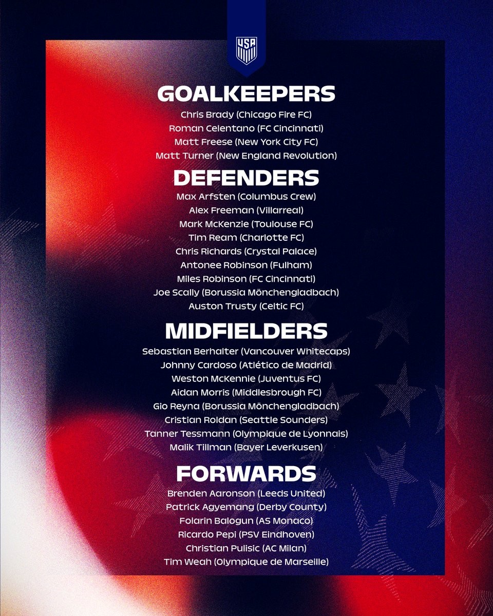 美国队新一期大名单:普利希奇领衔,麦肯尼、小维阿在列